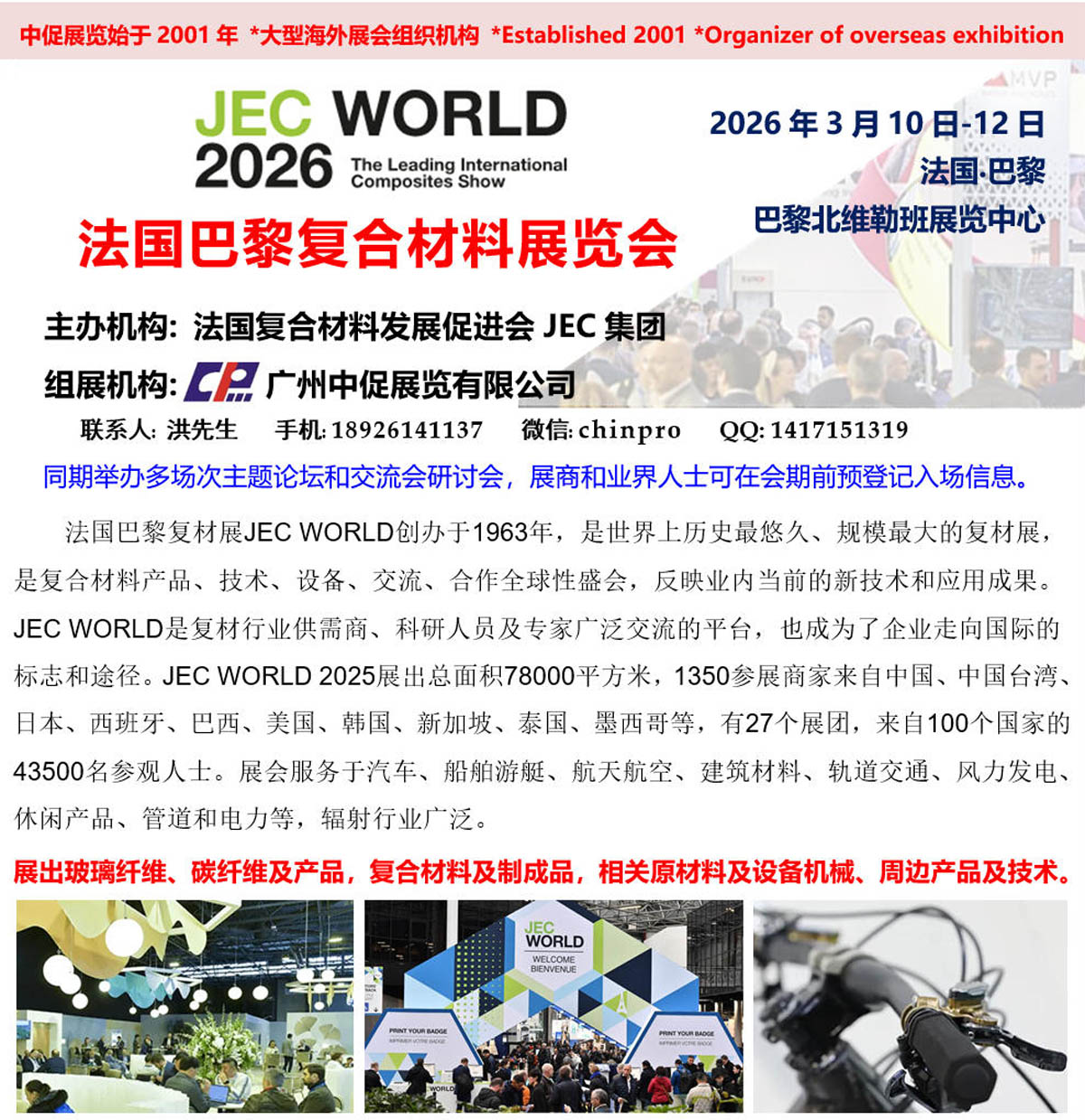 同期招展: 2026年3月10日-12日 | 法国•巴黎 | 法国巴黎复合材料展览会JEC WORLD 2026 |