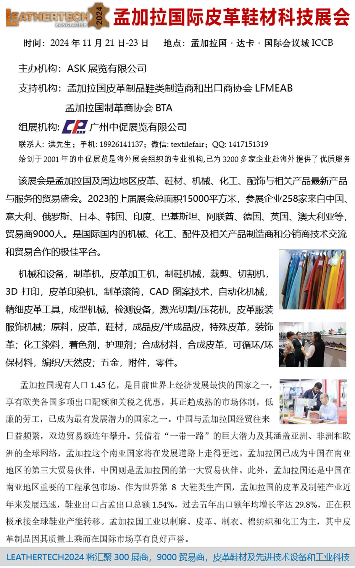 同期招展: 2024年11月21日-23日 | 孟加拉国·达卡 | 第10届孟加拉国际皮革鞋材科技展LEATHERTECH2024