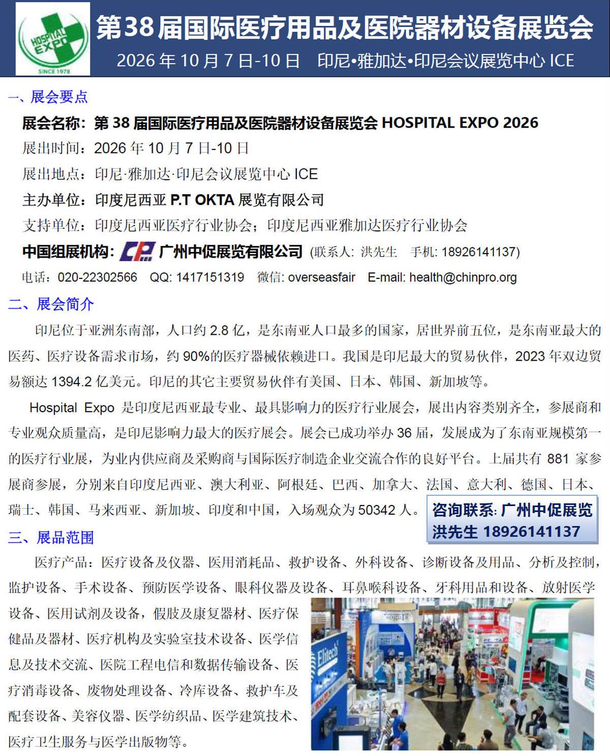 | 同期招展: 2026年10月7日-10日 | 印尼•雅加达 | 第38届国际医疗用品及医院器材设备展览会 |